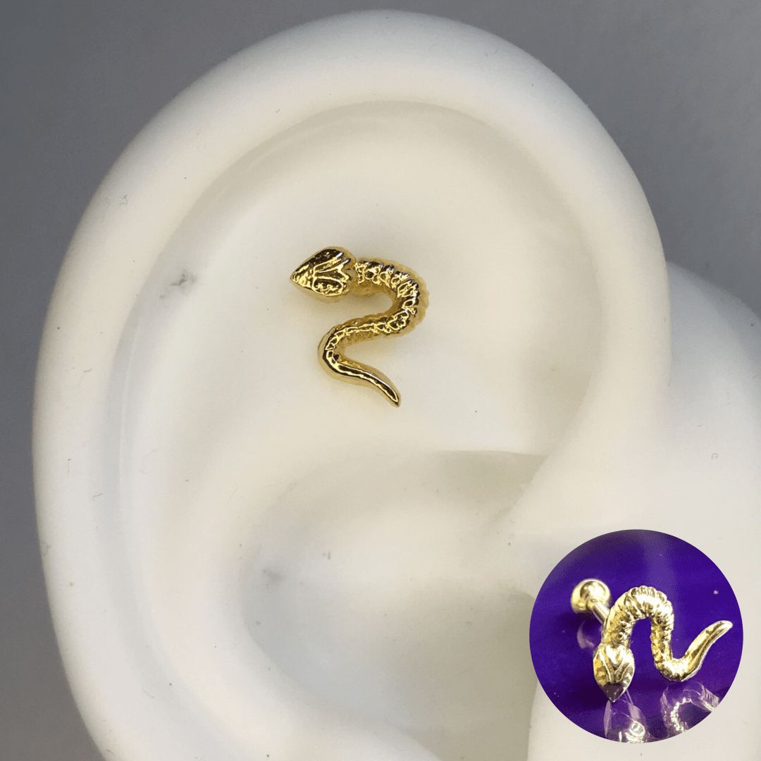 - Piercing de orelha, microbell cobra, folheado a ouro 18k.
